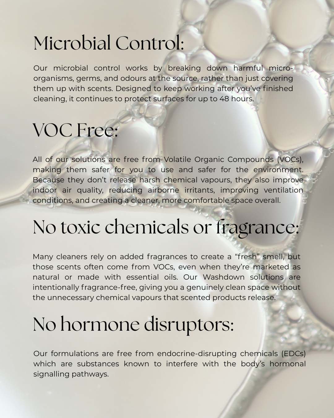 Washdown delivers high-performance, pH-neutral biotech cleaning without harming people, surfaces, or the planet. Designed for marine, hospitality, aviation, automotive and home environments, our formulas improve air quality, protect materials, are safe for aquatic life and are safe for restricted environmental areas.